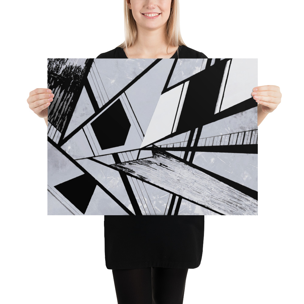 A high-contrast, black, white, and gray abstract geometric composition featuring interlocking vector shapes, dynamic angles, and layered textures. The composition creates a sense of deep perspective and modern, architectural complexity.