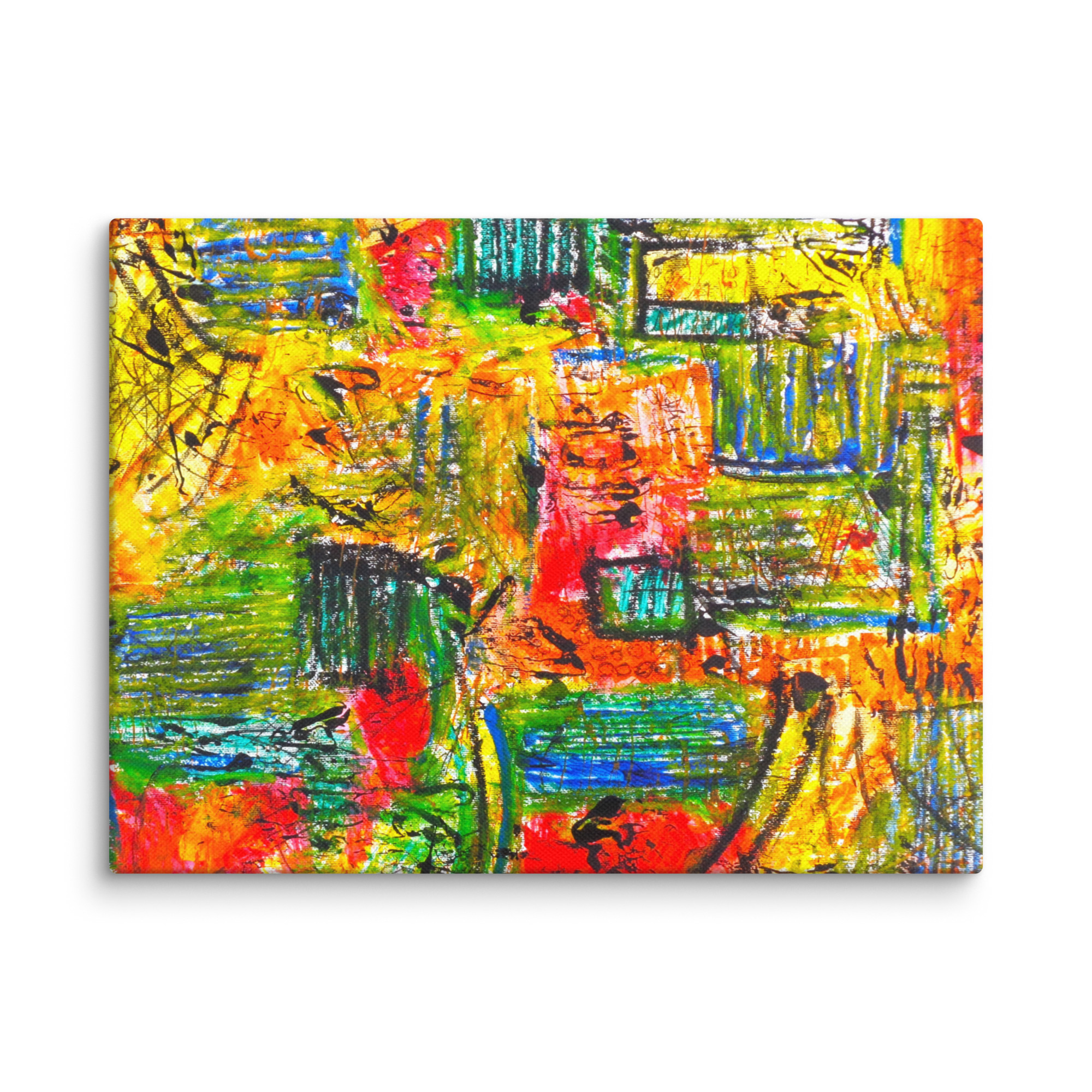 This captivating abstract artwork bursts with an electrifying palette of reds, yellows, greens, and blues, interspersed with stark black lines and forms. The composition features a textured, layered quality, evoking the bustling, layered feel of an urban landscape or a vibrant cityscape. Energetic brushstrokes and scribbled elements suggest movement and life, drawing the viewer into a dynamic visual experience.