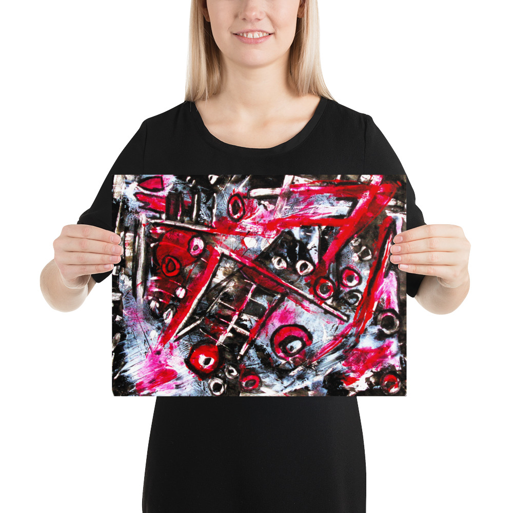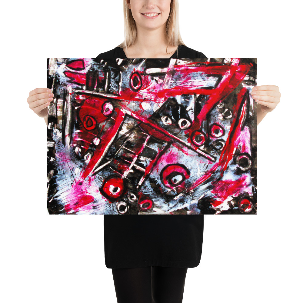 “Black Cap” is an energetic and visually complex abstract painting characterized by a bold palette of red, black, and white/grey tones. The composition is highly dynamic, featuring sharp angles, fragmented shapes, and circular motifs that interlock and overlap. Strong, gestural lines crisscross the surface, creating a sense of movement and tension. The interplay of dark and light areas, combined with the vibrant red, gives the artwork a powerful, almost industrial or urban feel, while also hinting at a deeper, unrevealed narrative.