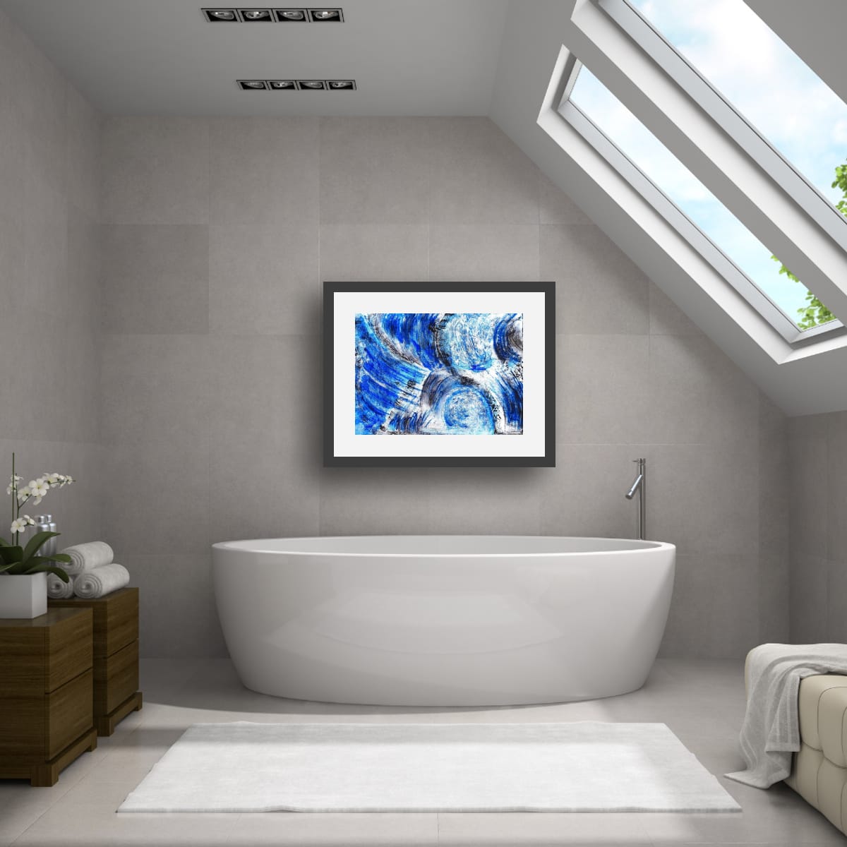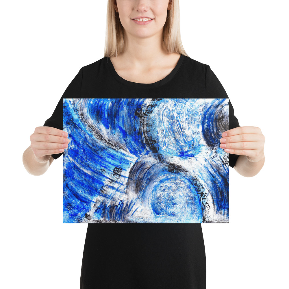 This abstract painting, titled “Blue Wave,” is a highly energetic composition dominated by swirling and sweeping brushstrokes of vivid blue, contrasting sharply with areas of stark white and interspersed with bold black accents. The textured application of paint creates a sense of rapid movement and depth, strongly evoking the power and motion of ocean currents or crashing waves.