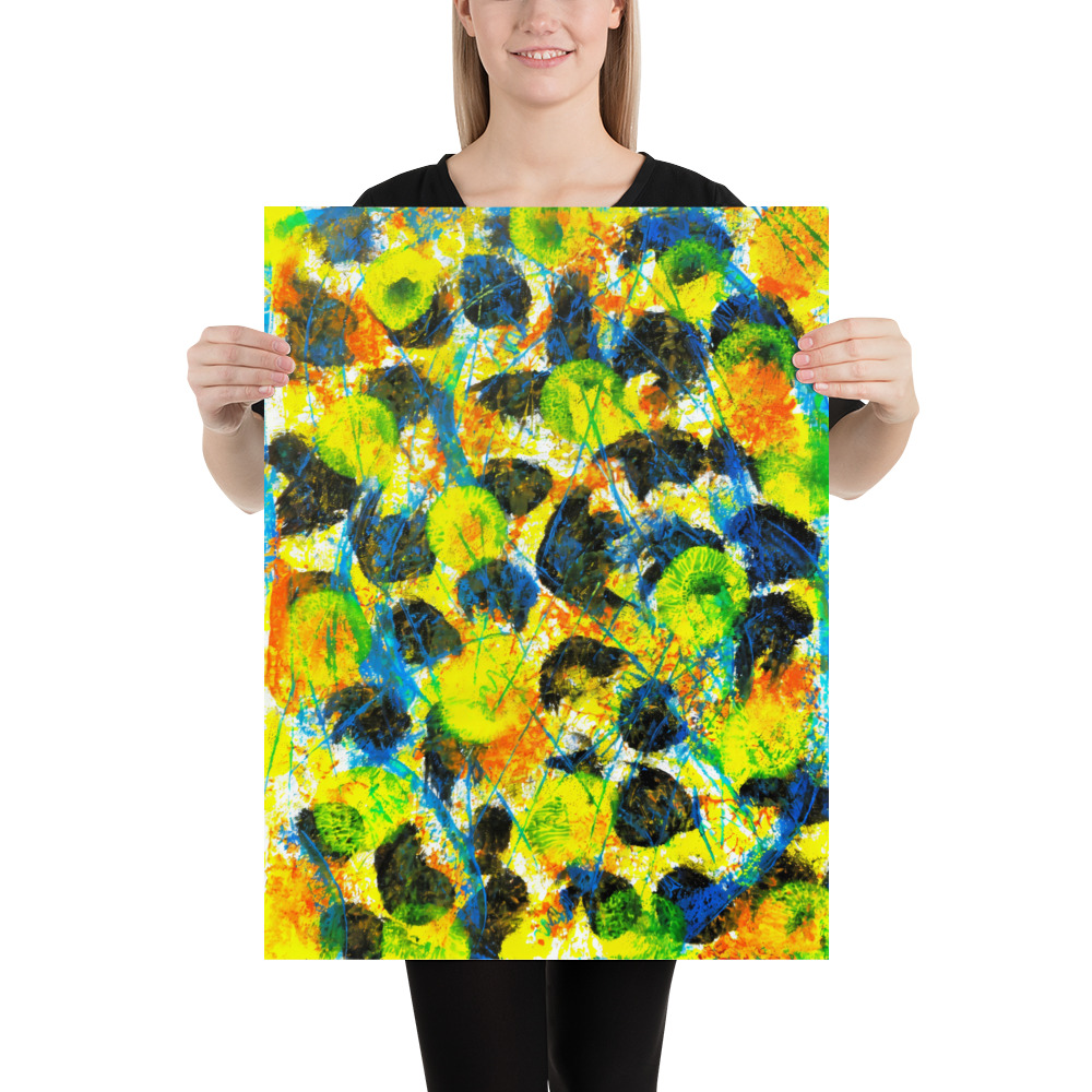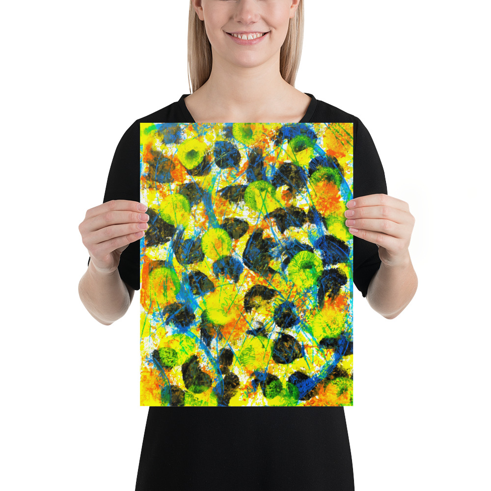 “Blues” is an energetic abstract painting characterized by its vibrant and seemingly chaotic composition. The artwork features a lively mix of blues, yellows, greens, and touches of orange, with prominent dark circular and organic shapes that add depth and contrast.