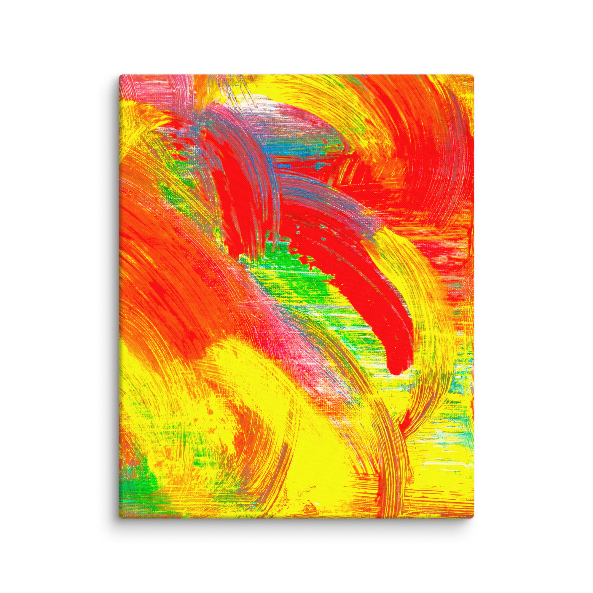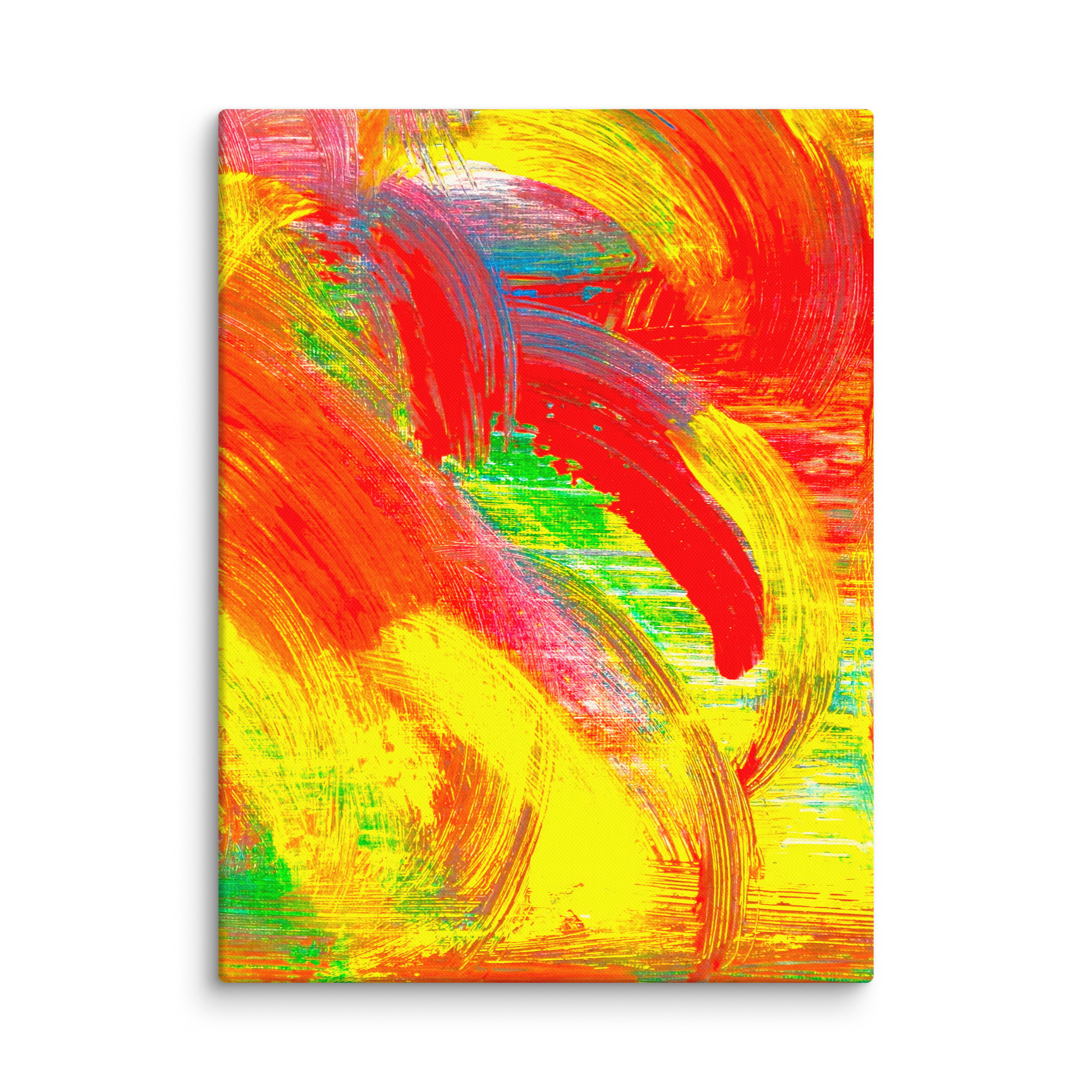 An intensely dynamic abstract painting characterized by bold, swirling, and energetic brushstrokes. The primary colors are a fiery spectrum of deep reds, brilliant yellows, and neon oranges, which are applied in wide, sweeping arcs, giving the entire composition a sense of motion and vitality.