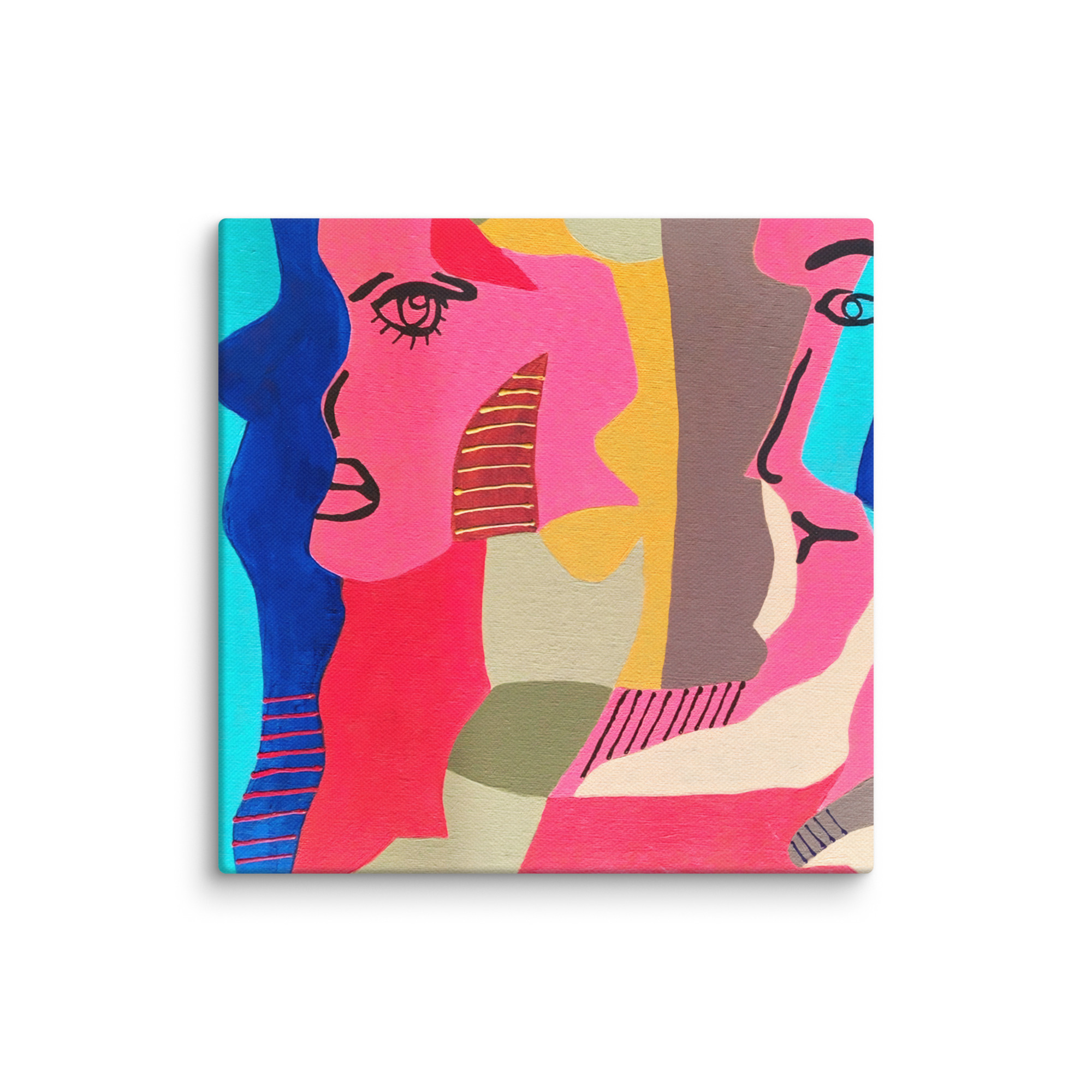 This painting is a vibrant, modern interpretation of Cubism, featuring fragmented and interlocking profiles and faces rendered in a bold, high-contrast color palette. Dominant blocks of hot pink, deep red, and electric blue are contrasted with earthy olive, mustard yellow, and cyan backdrops. Two distinct profiles are visible, their features—such as eyes and lips—outlined sharply in black, suggesting an intense or complex interaction.