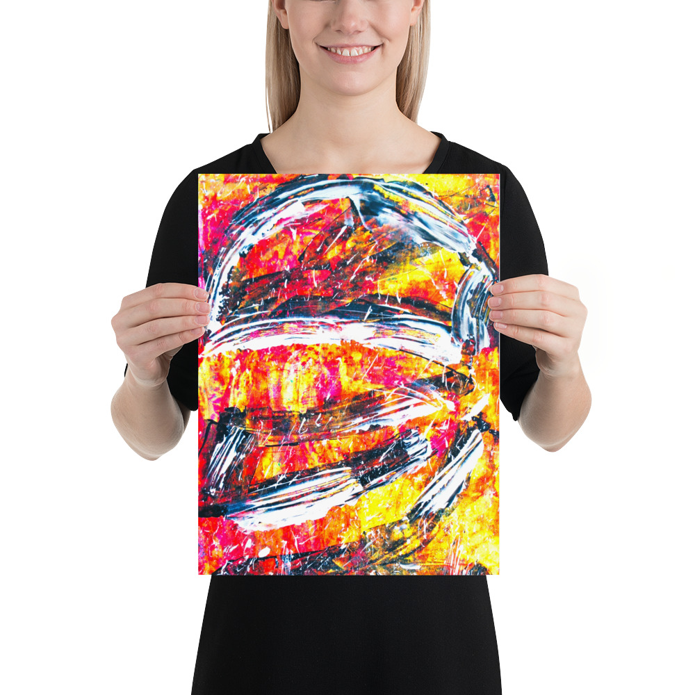 “Cyborg” is an explosively vibrant abstract artwork bursting with intense reds, oranges, and yellows, punctuated by dynamic white and black strokes. The composition features sweeping, curved gestures and a sense of raw energy, creating a visually stimulating piece that evokes both chaos and controlled movement.