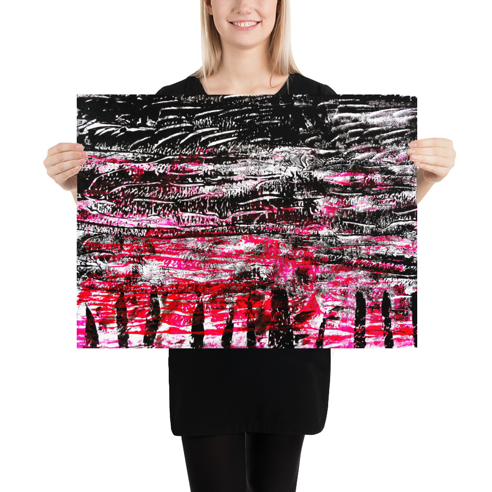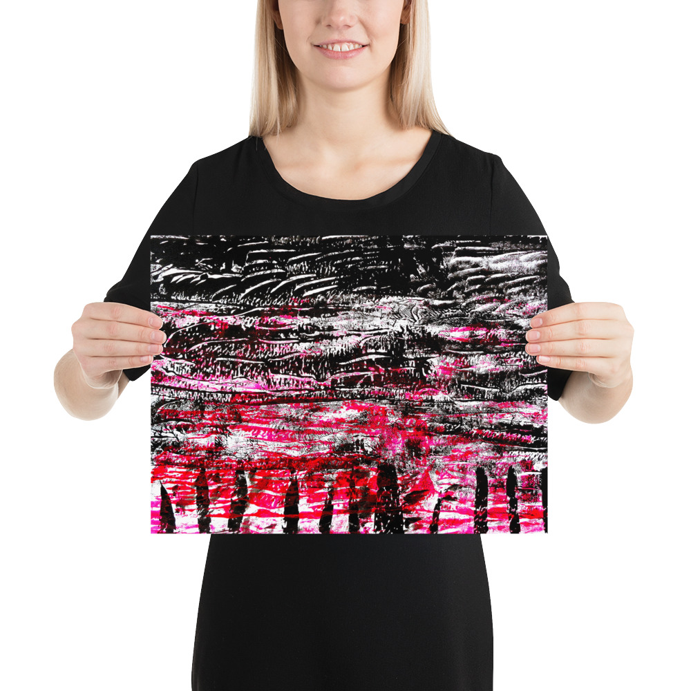 “D Day” is a compelling abstract painting that uses a stark and powerful palette of black, white, and intense red to convey a sense of historical weight and dramatic intensity. The composition features strong horizontal lines and heavily textured brushstrokes, suggesting a tumultuous landscape and a chaotic event.
