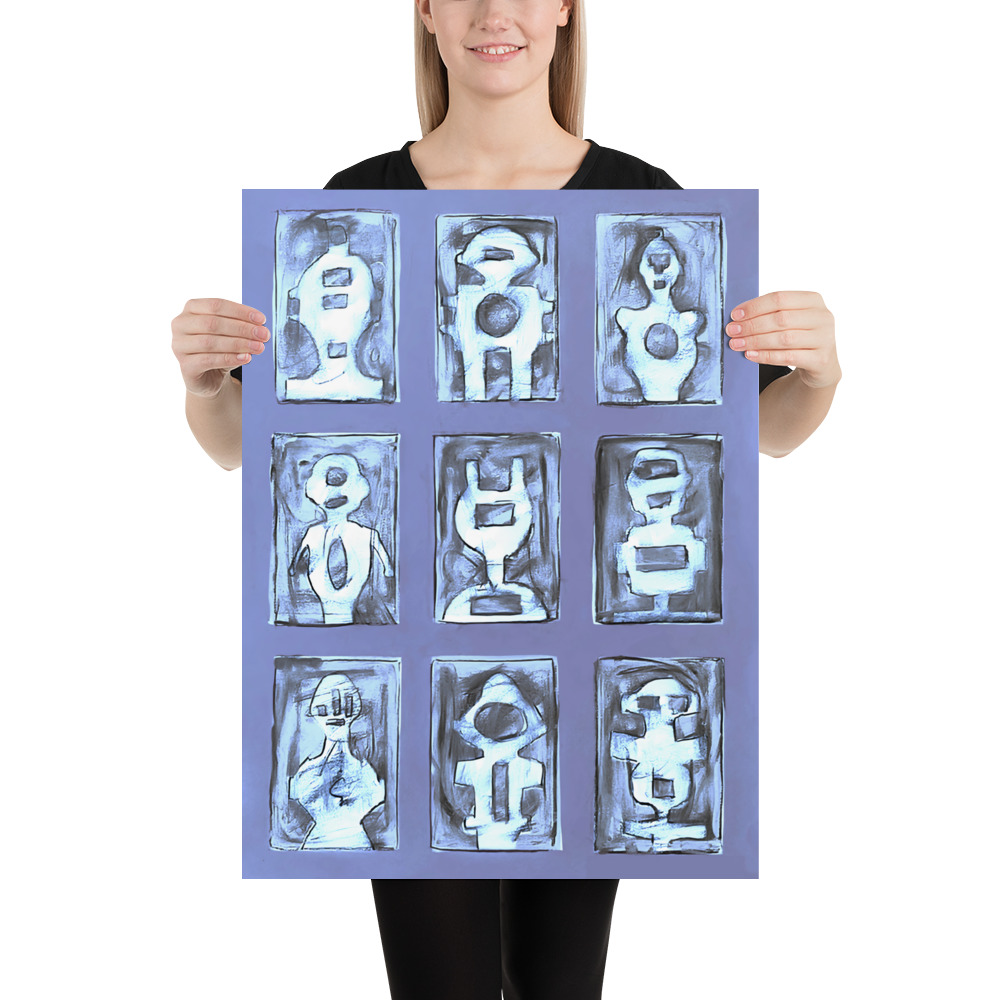 A subtle, cool-toned figurative abstract artwork structured in a 3×3 grid. The piece features nine stylized, white and charcoal figures, resembling primitive or robotic forms, framed by dark blue-grey rectangular borders, all set against a muted periwinkle background