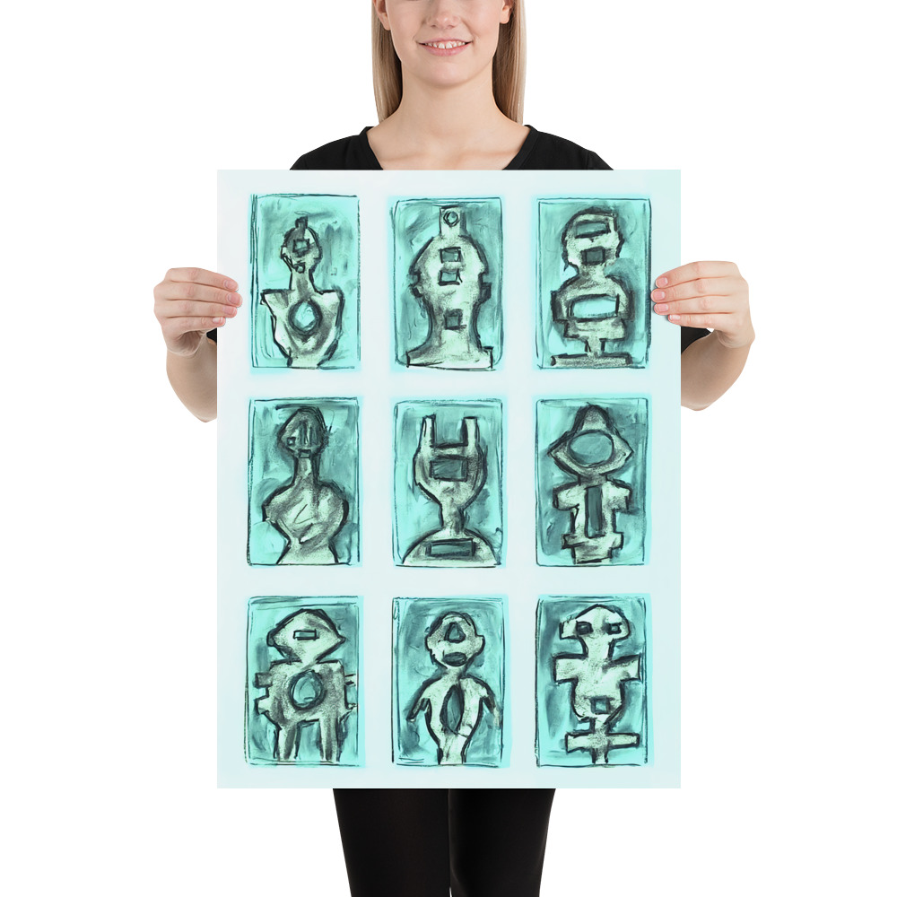 A distinctive figurative abstract artwork presented in a 3×3 grid, dominated by a cool teal-green and charcoal palette. The composition features nine stylized, pale figures, suggesting primitive relics or machine parts, each set within a teal-framed rectangle against a crisp white background.