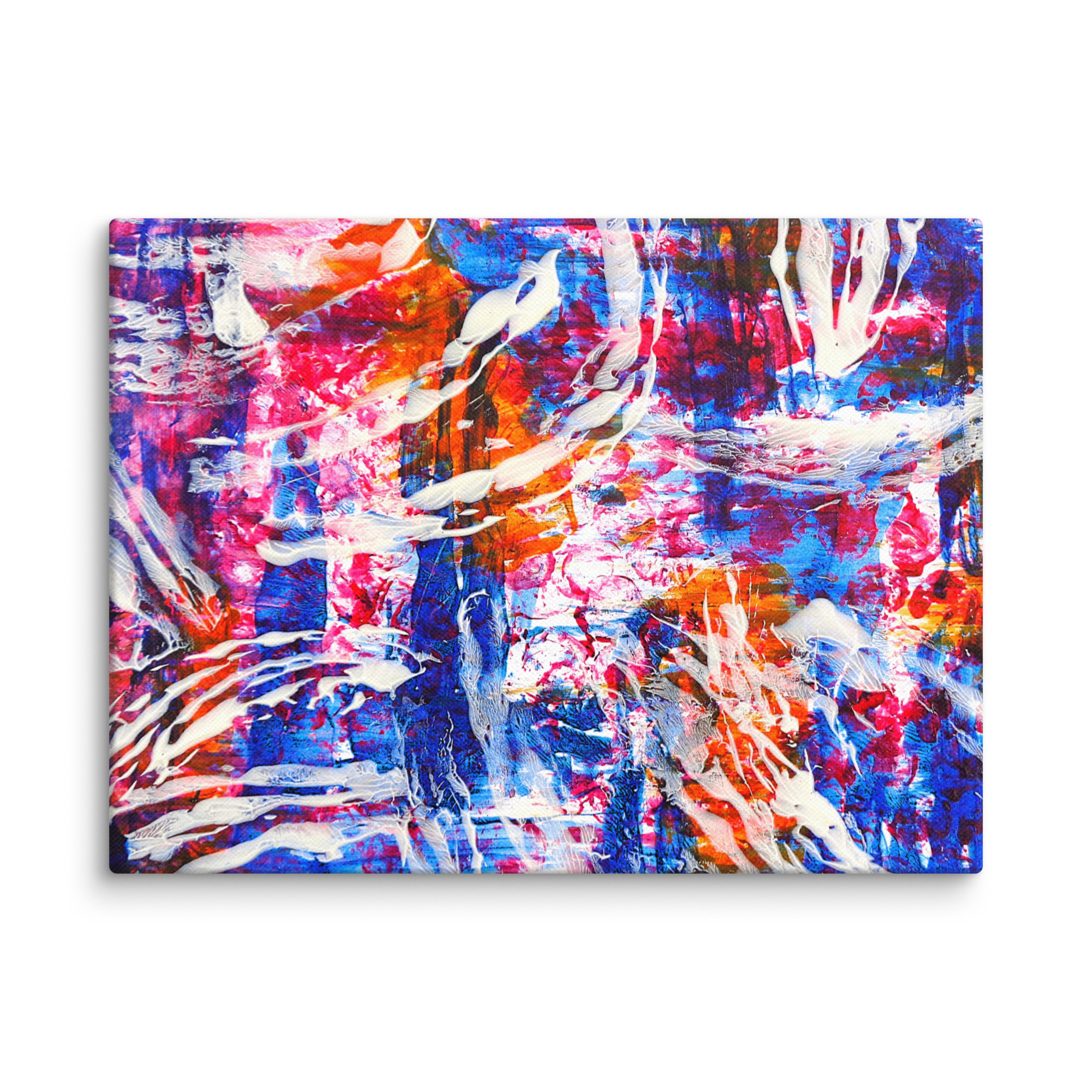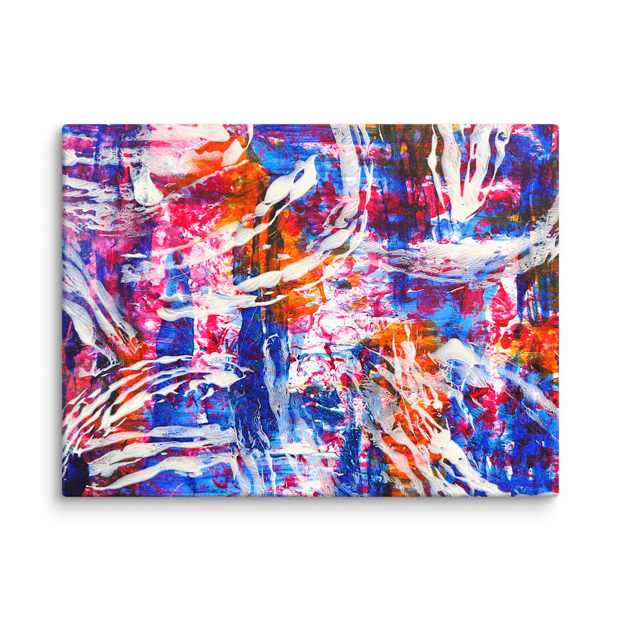 “Froth” is a captivating abstract mixed media artwork characterized by its energetic composition and rich textural qualities. The vivid palette of blues, reds, and oranges, with striking white accents create a sense of movement and depth.