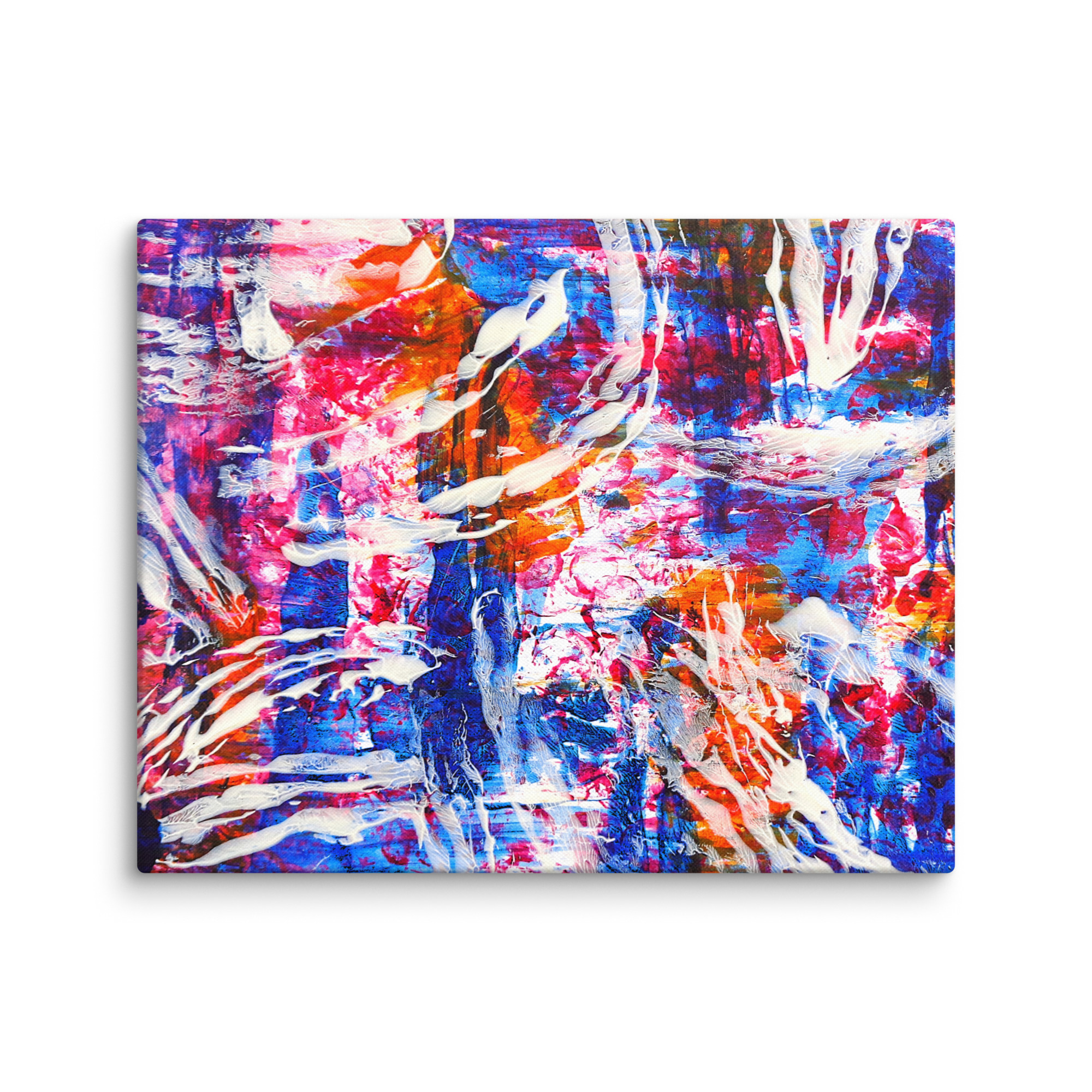“Froth” is a captivating abstract mixed media artwork characterized by its energetic composition and rich textural qualities. The vivid palette of blues, reds, and oranges, with striking white accents create a sense of movement and depth. The interplay of colors and textures evokes a feeling of effervescence and fluidity, making it a dynamic piece for any modern space.