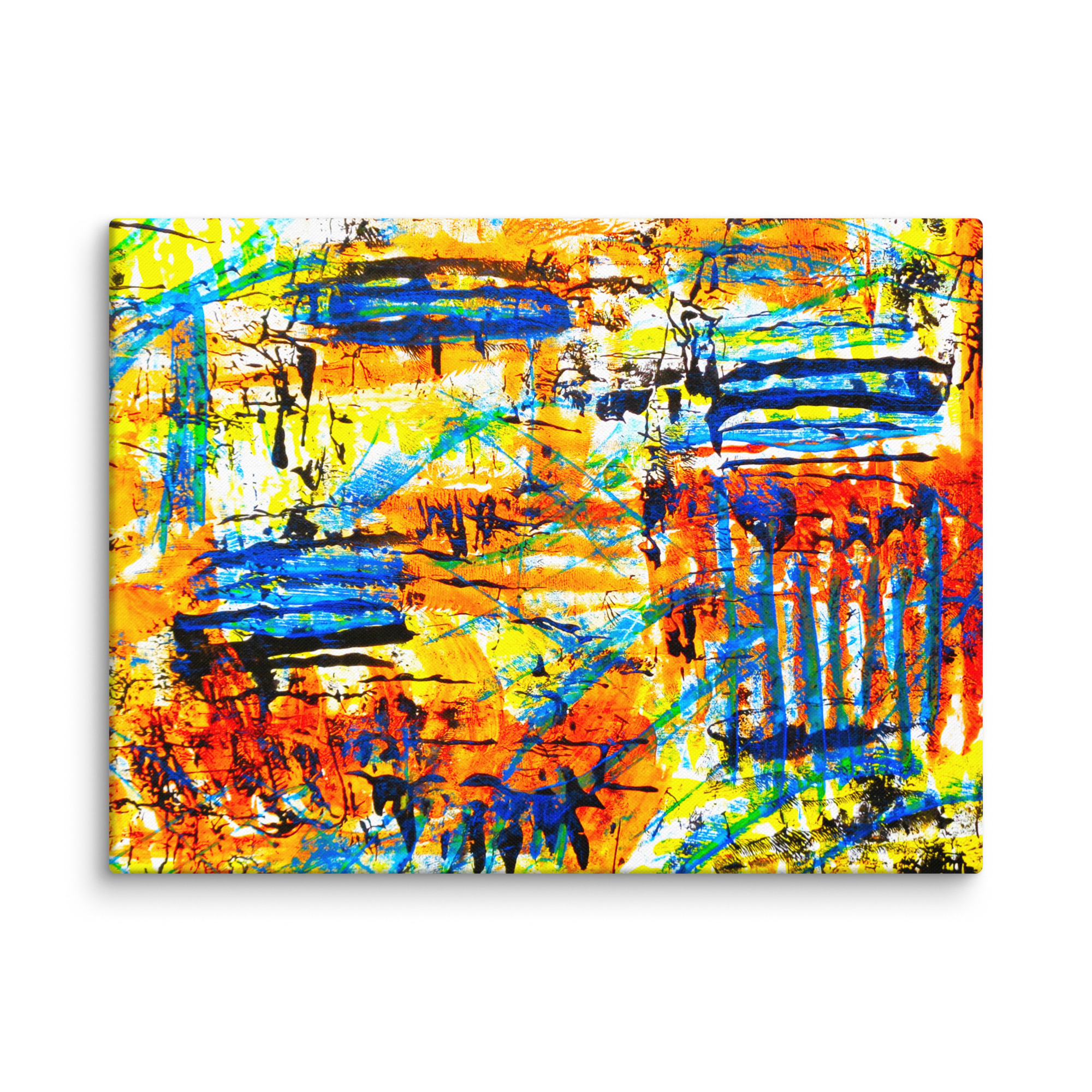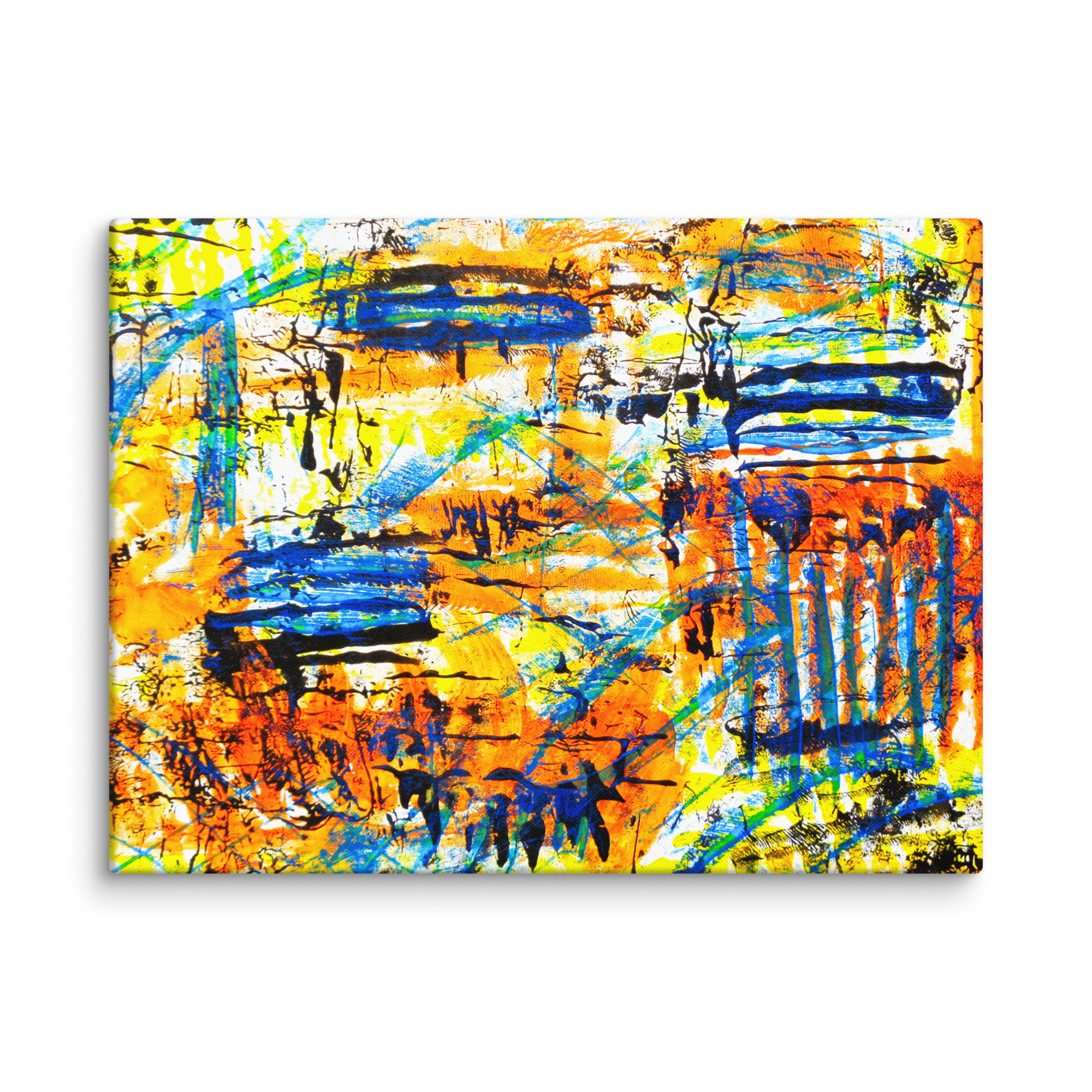 This dynamic abstract piece explodes with the vibrant energy of the landscape. Bold strokes of electric blue cut across a fiery canvas of yellows and oranges, punctuated by sharp, dark lines that hint at untamed textures and raw emotion.