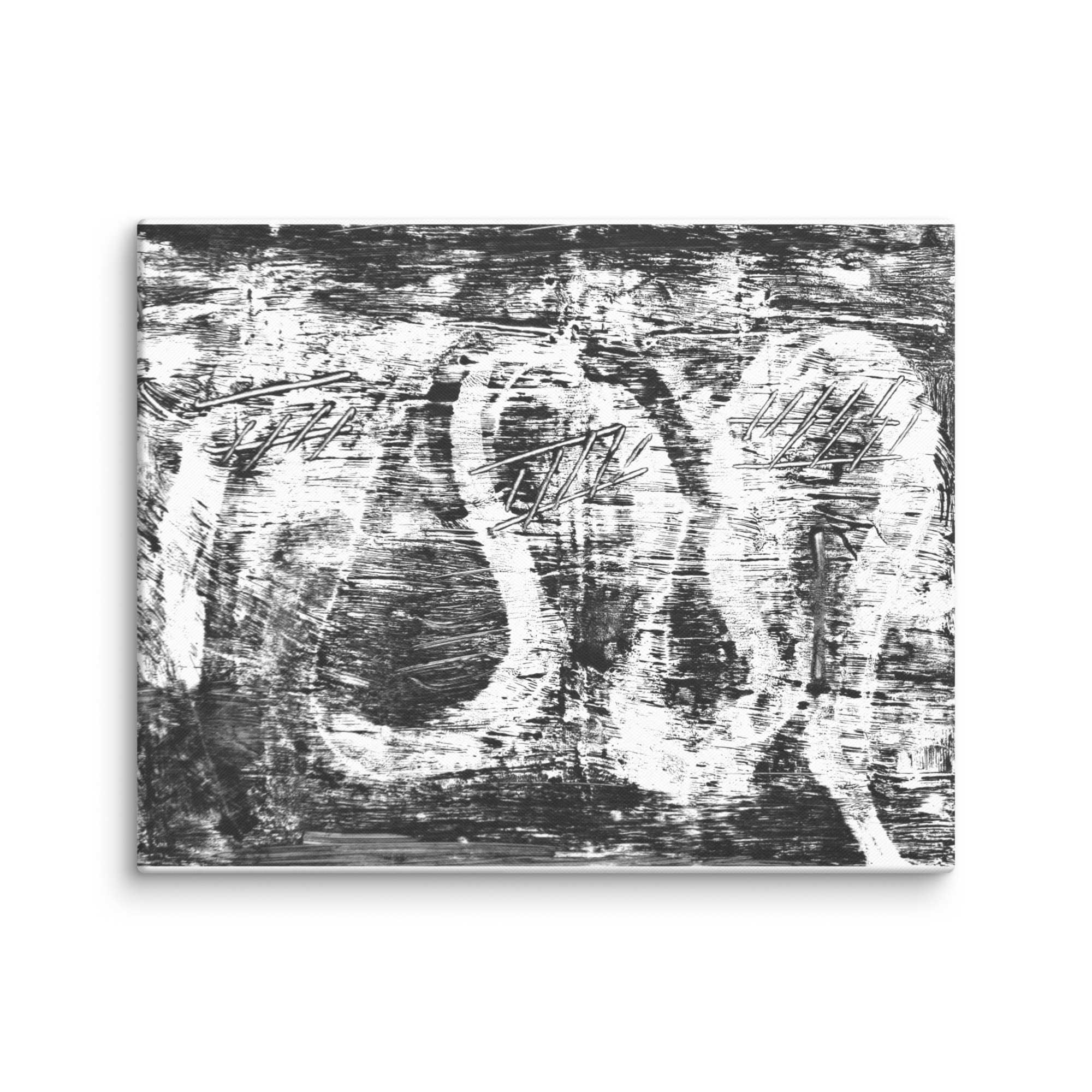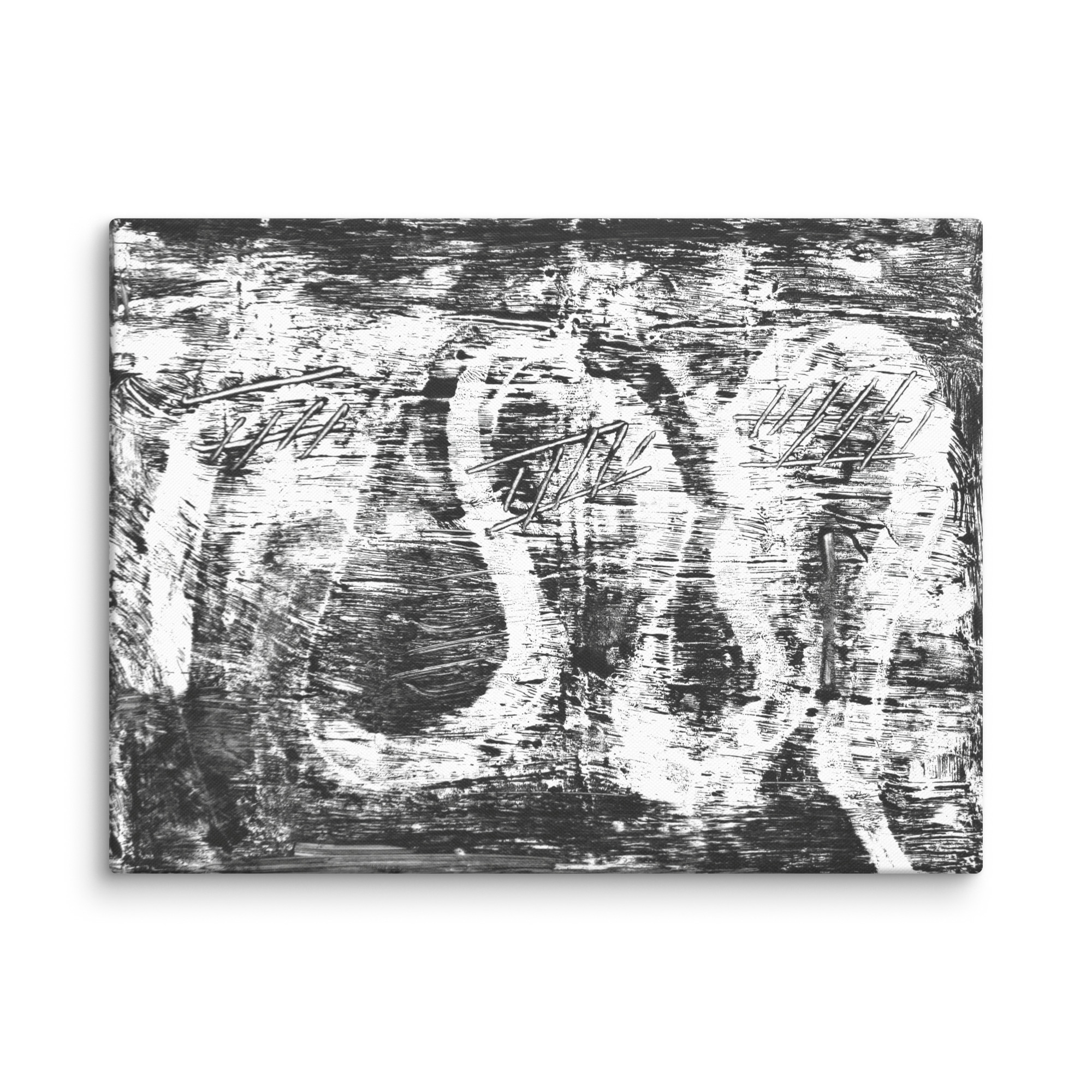“Hidden,” is a powerful monochromatic piece dominated by black and white tones. It features a rich, distressed texture with visible brushstrokes and scraped marks that create a sense of raw energy and hidden depths. Within the chaotic yet structured surface, elusive circular and linear forms emerge and recede, suggesting concealed figures or symbols.