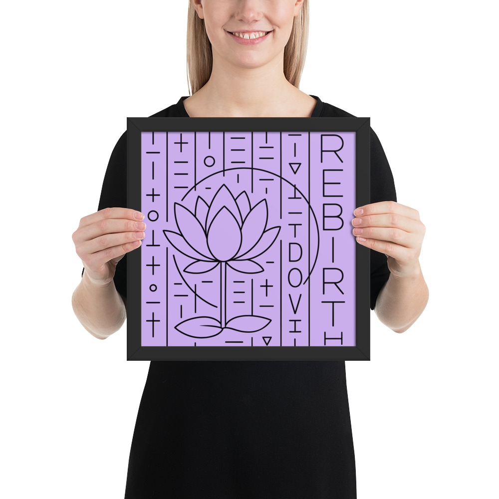 The central focus is a stylized lotus flower with a long stem, a classic symbol of rebirth, purity, and perseverance. The floral motif is framed by a circle and surrounded by abstract lines and symbols, with the word “REBIRTH” displayed vertically along the right edge. The design is contemporary, graphic, and conveys a powerful message of transformation and new beginnings.