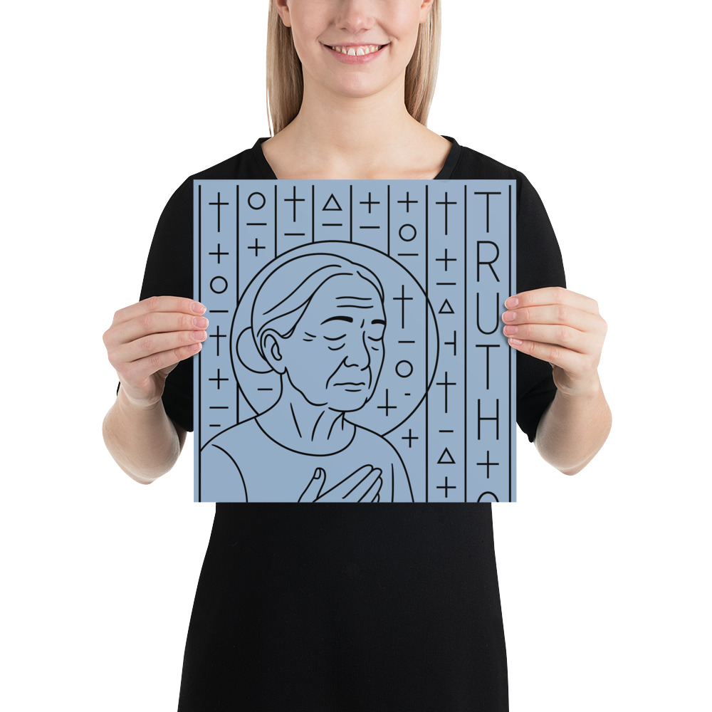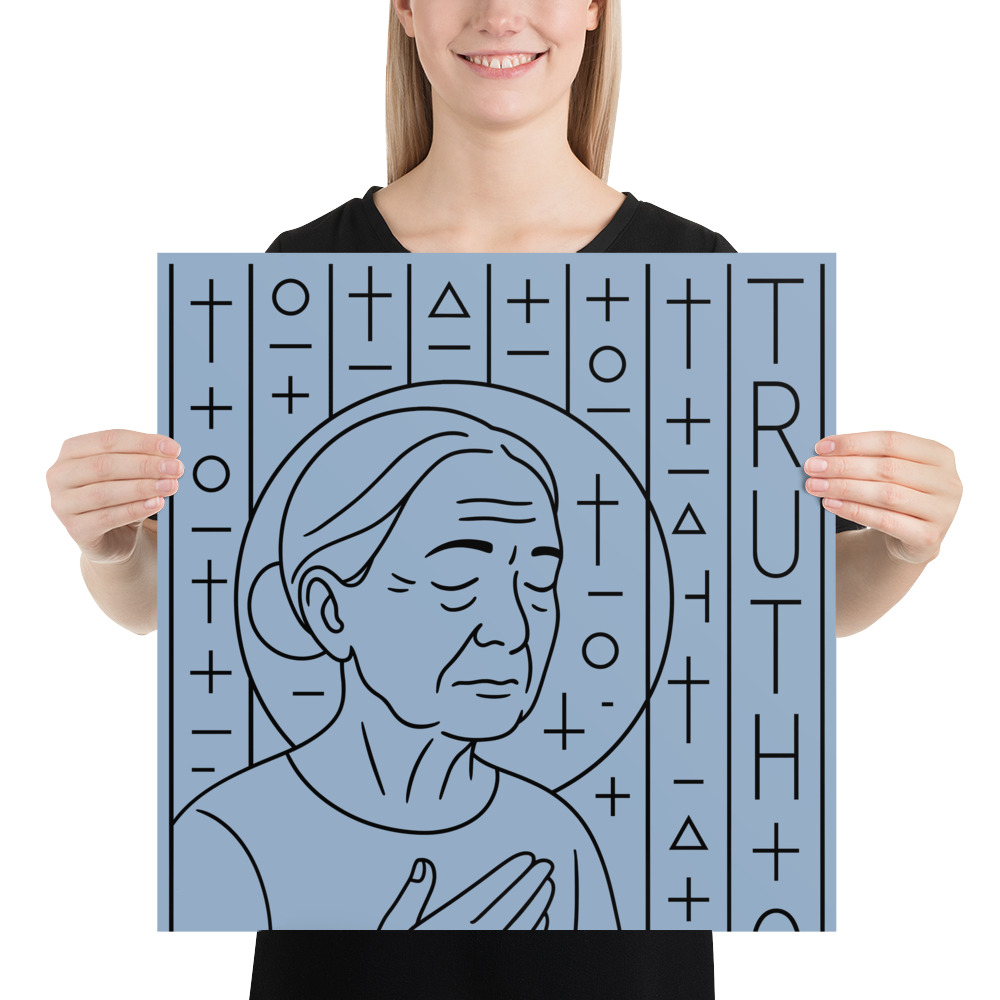 This is a striking, minimalist line art illustration set against a soft, muted blue background. It portrays the head and shoulders of an older figure with a calm, reflective expression, embodying sincerity and the search for inner truth. The figure holds a hand over their heart in a classic gesture of honesty and is framed by abstract symbols and the prominent vertical text: “TRUTH.”