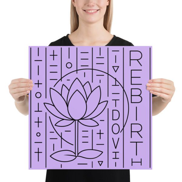The central focus is a stylized lotus flower with a long stem, a classic symbol of rebirth, purity, and perseverance. The floral motif is framed by a circle and surrounded by abstract lines and symbols, with the word “REBIRTH” displayed vertically along the right edge. The design is contemporary, graphic, and conveys a powerful message of transformation and new beginnings.