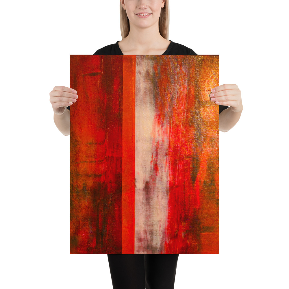 This abstract painting utilizes a strong vertical composition dominated by intense, contrasting color fields. The left and right panels are rich in deep, visceral reds, burnished oranges, and earthy browns, suggesting warmth, fire, or rust, with visible texture and atmospheric depth.