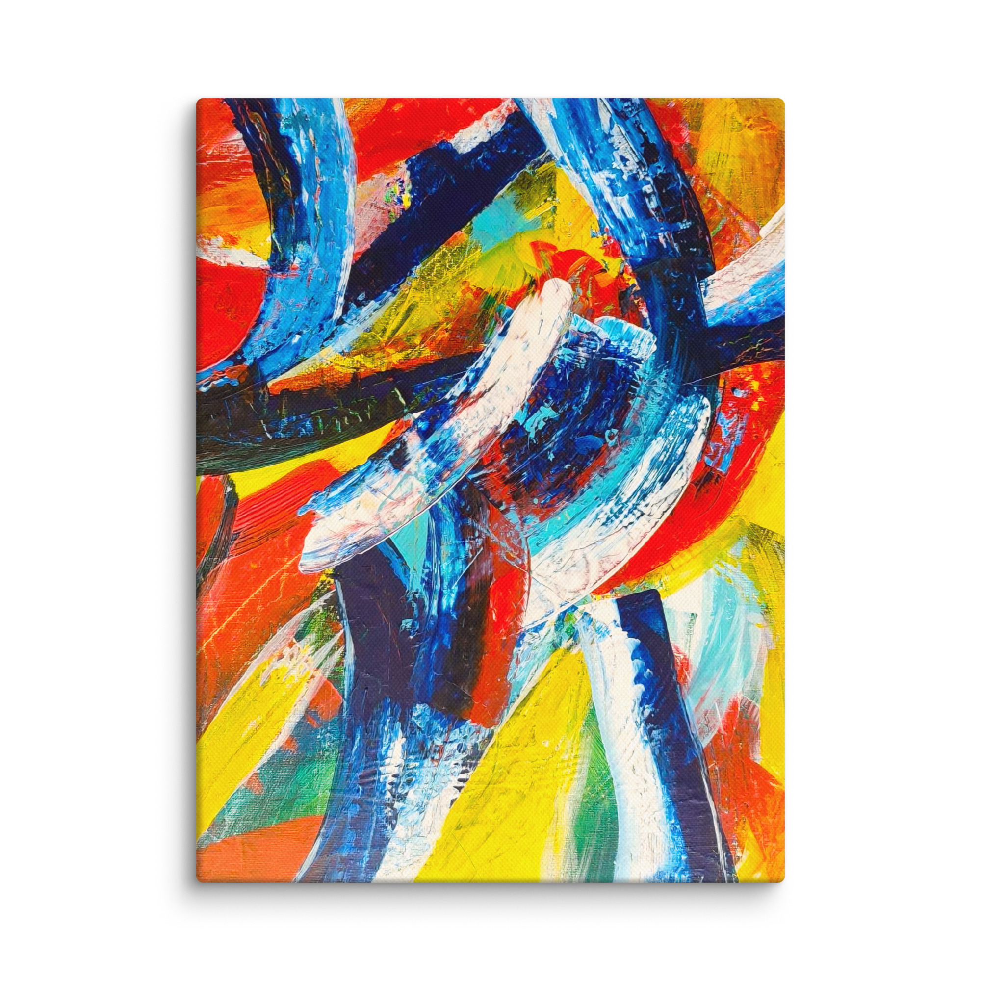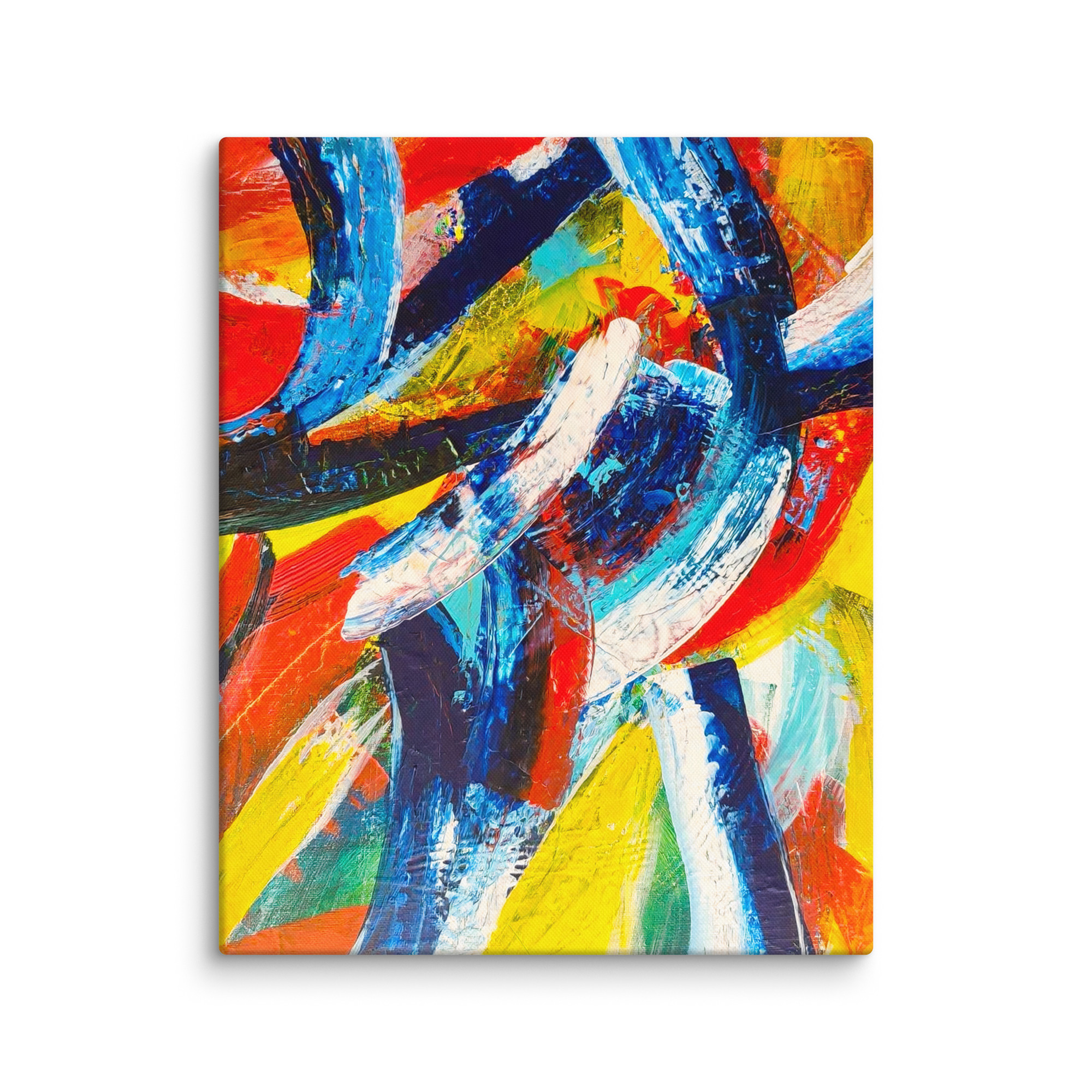 This is a striking example of abstract expressionism, dominated by a high-energy composition and vibrant, saturated colours. Bold, sweeping strokes of electric blue and pure white cut across a background of intense red and luminous yellow, creating a strong sense of movement and visual tension. The application of thick acrylic paint gives the piece a rich, textured surface, enhancing the raw, dynamic feeling. The overall effect is one of exhilarating chaos and powerful emotional expression.