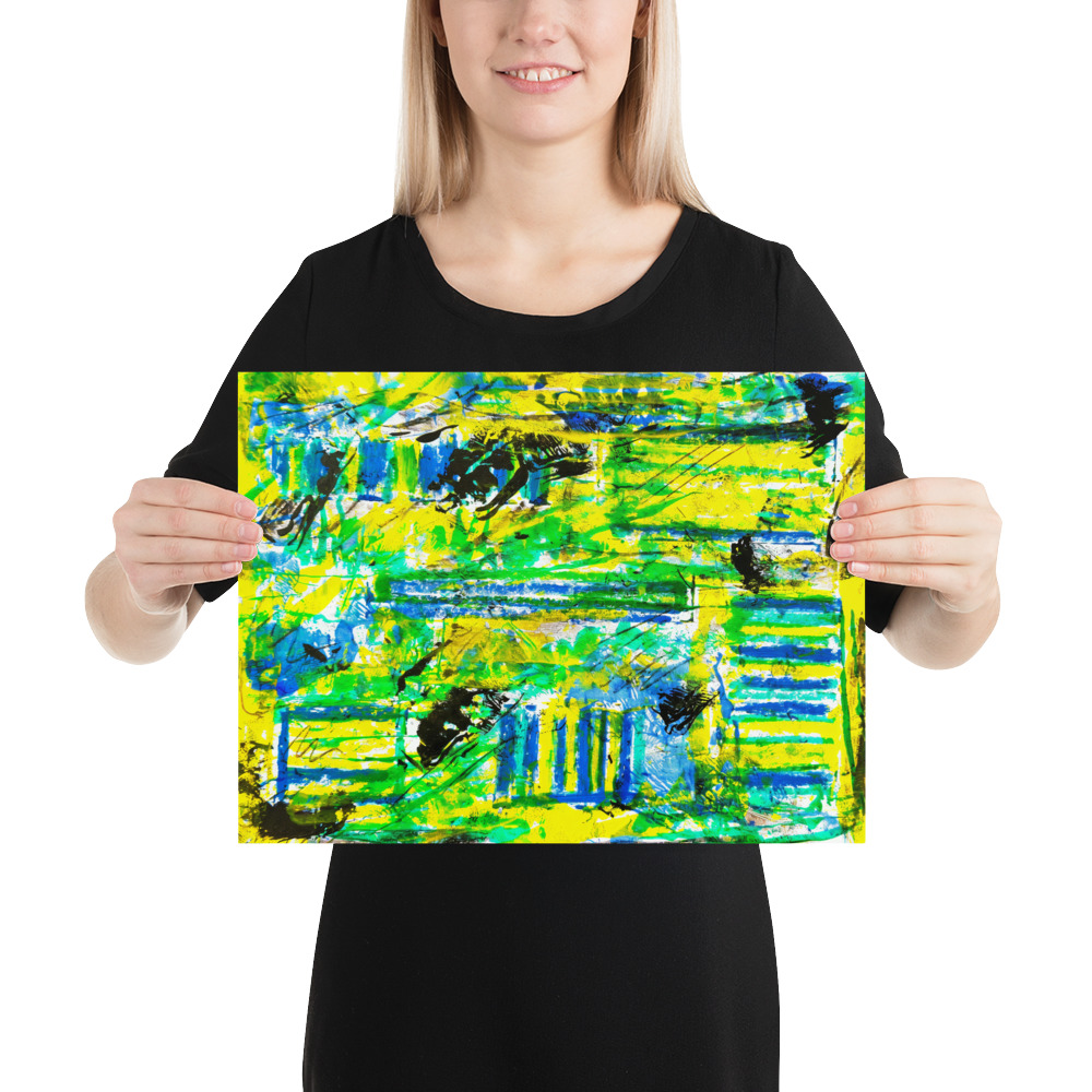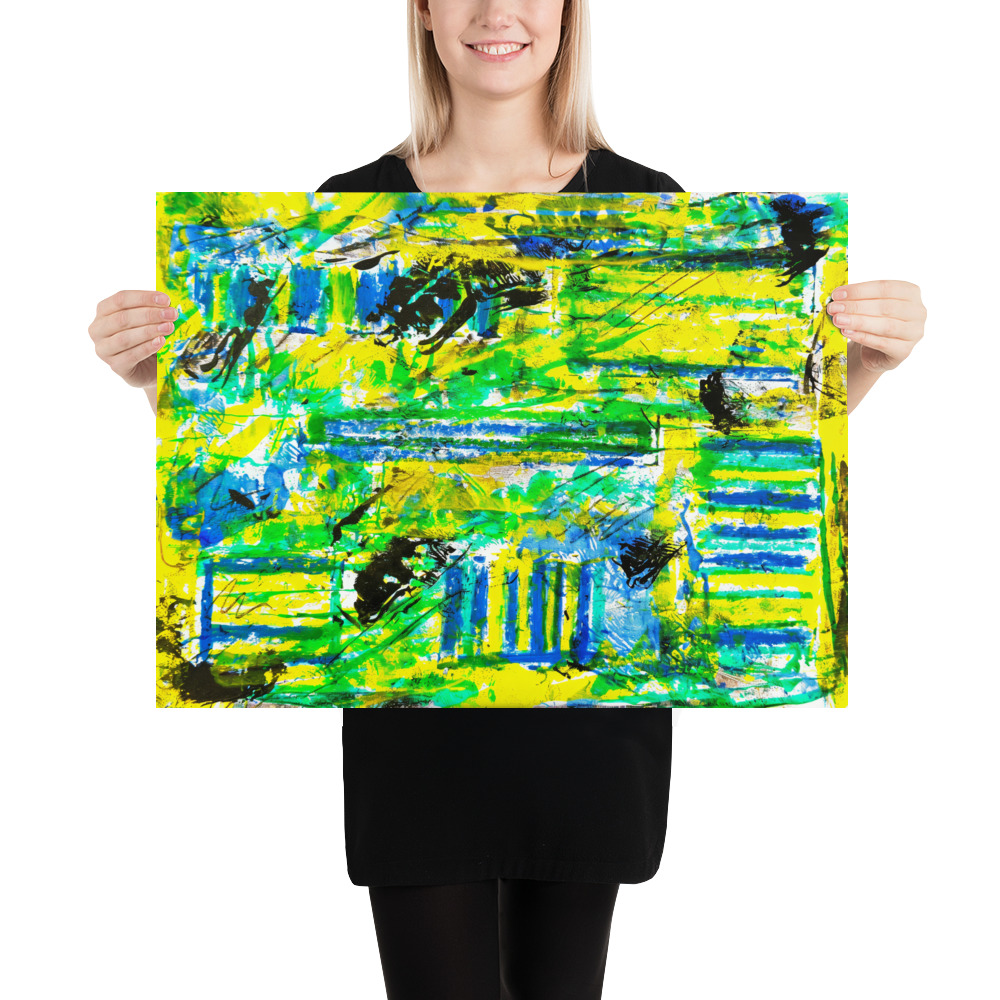 “Vivid Fields” is an exceptionally vibrant and energetic abstract painting, dominated by a luminous yellow and various shades of green and blue. The composition is highly dynamic, characterized by bold, horizontal and vertical strokes, and splatters that create a sense of frantic movement.